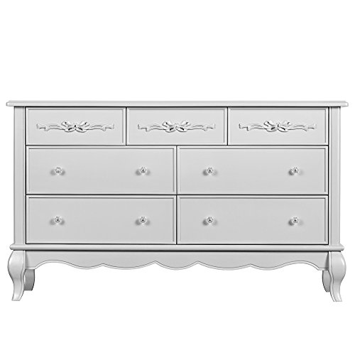 The Evolur Aurora 7 Drawer Double Dresser showcase soft, feminine carvings, crystal and metal knobs Tested for lead and other toxic elements to meet or exceed government and ASTM safety standards