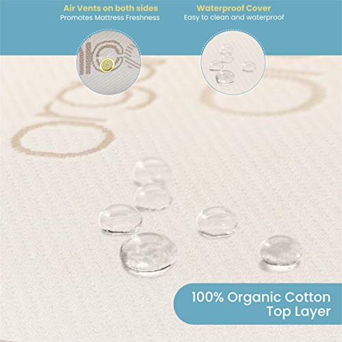 Waterproof cover with 100% Organic Cotton top layer cradles your baby’s delicate skin. Non-toxic, non-allergenic and luxurious to the touch.