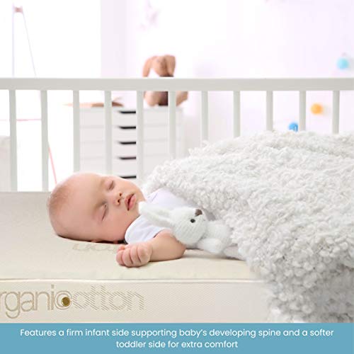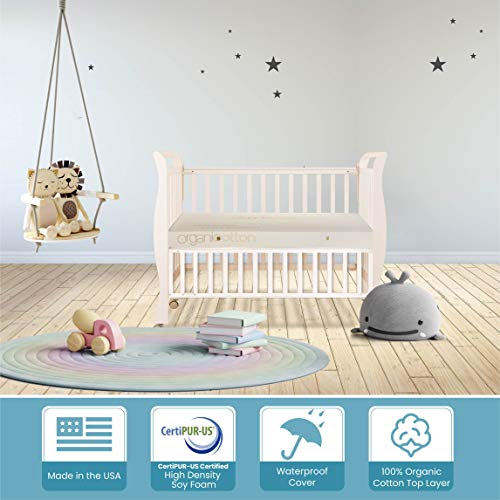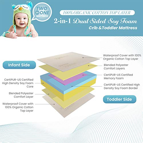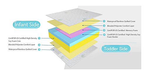 The LA Baby 2-in-1 dual-sided crib mattress has a firm infant side that provides better support, and the toddler side features a CertiPUR-US certified memory foam layer for enhanced comfort. Waterproof cover with 100% Organic Cotton top layer cradles your baby’s delicate skin. Non-toxic, non-allergenic and luxurious to the touch. The CertiPUR-US Certified soy foam core provides support to baby’s developing spine and a comfortable night’s sleep at any age. Air-vents to promote a fresh mattress and cloth binding to prevent edge seams from splitting. Proudly made in the U.S.A. from domestic and imported sources.
