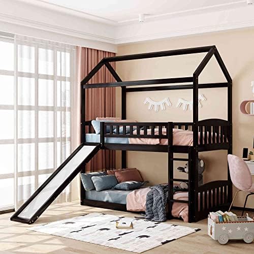 【Slide for Fun】–The house twin bunk bed with slide offers extra fun to child. The slide is smooth and with handrial to keep safe. Ladder attached for climbing up and down. Both ladder and slide can be installed on the left or right side. You can choose the installation method according to your preferences or room layout.